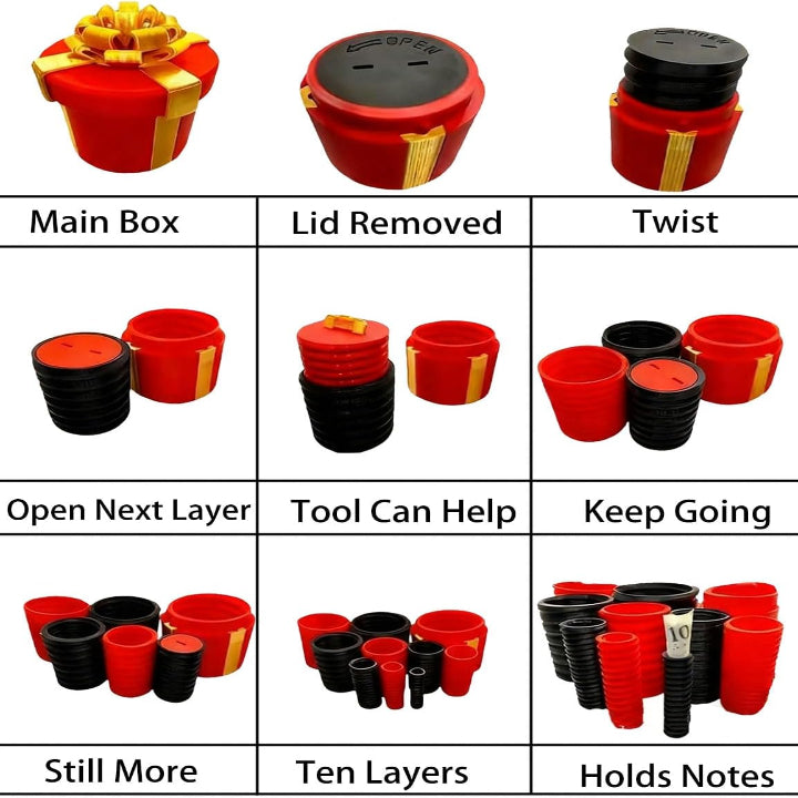Entdecken Sie die Freude am Schenken mit einem Twist! Unsere Puzzle-Schraub-Geschenkbox verwandelt das Geschenk-Erlebnis in eine spannende und spielerische Herausforderung. Hergestellt aus leichtem, wiederverwendbarem Kunststoff mit einer eleganten Rot-Gold-Finish, eignet sie sich perfekt zum Aufbewahren von Geld, Schmuck, Notizen und kleinen Erinnerungsstücken. Machen Sie jeden Anlass mit dieser cleveren, stilvollen Geschenkbox unvergesslich.