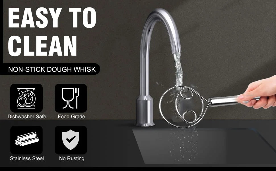 Verabschieden Sie sich von dem ermüdenden Kampf beim manuellen Rühren und begrüßen Sie müheloses Backen mit unserem lebensmittelechten Edelstahl-Teigrührer. Entwickelt, um jeden Teig oder jede Masse mühelos zu verarbeiten, hilft Ihnen dieser Schneebesen, perfekte Muffins, Kuchen, Pfannkuchen und mehr zu zaubern. Sein abgerundetes Design schabt jeden Rest Teig aus der Schüssel, spart Ihnen Zeit und minimiert Abfall, während seine glatte Oberfläche die Reinigung schnell und einfach hält. Stellen Sie sich vor, Sie mixen Teig schneller und sauberer, damit Sie sich auf die Freude am Backen und das Teilen köstlicher hausgemachter Leckereien konzentrieren können.